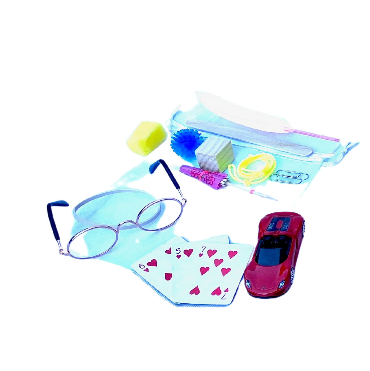 6 objetos pequeños con función y 6 objetos pequeños sin función definida, originales test ADOS-2 incluye candelabro en miniatura metálico.