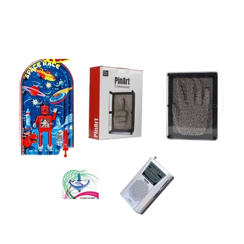 Descanso: 1 radio pequeña, 1 trompo rotulador original test ADOS-2, 1 Pinart metálico original y 1 pinball original.